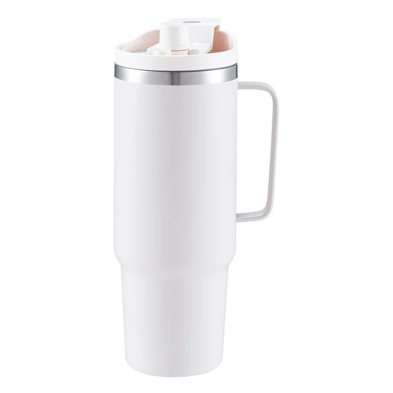 The insulated large stainless steel coffee tumbler with white handle and flip-top lid balances thermal retention, ergonomic handling, and sleek design. Double-wall insulation, leak-resistant flip-top lid, and ergonomic handle make it suitable for commuting, office use, outdoor activities, and corporate gifting. Controlled manufacturing processes, including vacuum creation, wall uniformity, and ergonomic testing, ensure consistent product quality. For B2B buyers, this tumbler offers a combination of performance, durability, and customization potential.